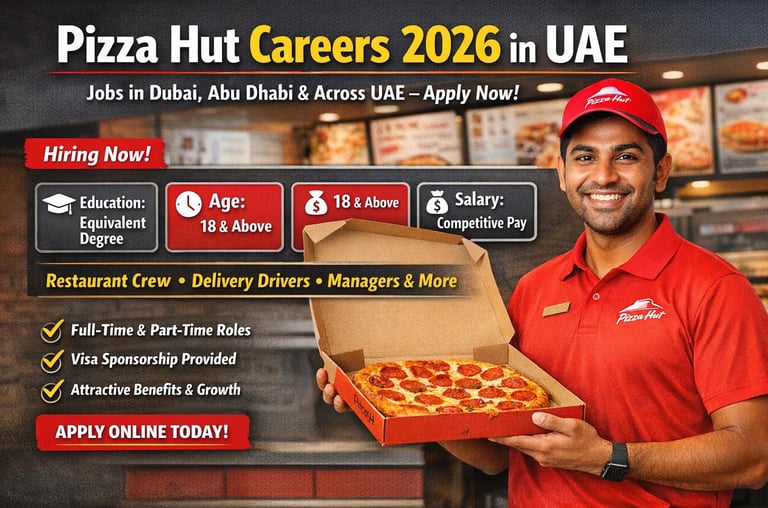 Looking for exciting job opportunities at Pizza Hut in the UAE? Apply for full-time & part-time roles in Dubai, Abu Dhabi & other cities. Positions include Restaurant Crew, Delivery Drivers, Pizza Makers, Supervisors & Managers. Benefits, competitive salaries & visa sponsorship available. Apply online now!