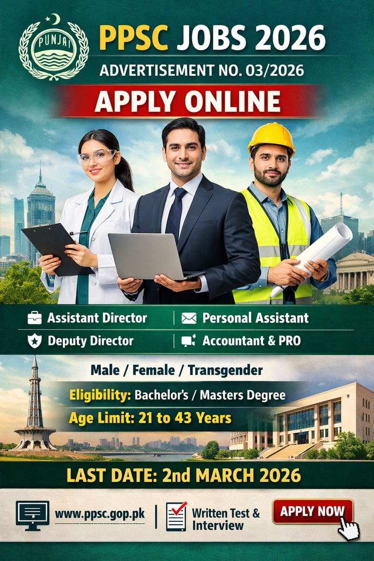 Punjab Public Service Commission (PPSC) has announced new government jobs through Advertisement No. 03/2026 in various departments including the Punjab Environment Protection and Climate Change Department, Punjab Food Authority. These positions are offered on a contract basis for 3 years and are open to male, female, and transgender candidates having Punjab domicile. Eligible candidates with relevant qualifications and experience can apply online through the official PPSC website before the closing date of 02 March 2026.